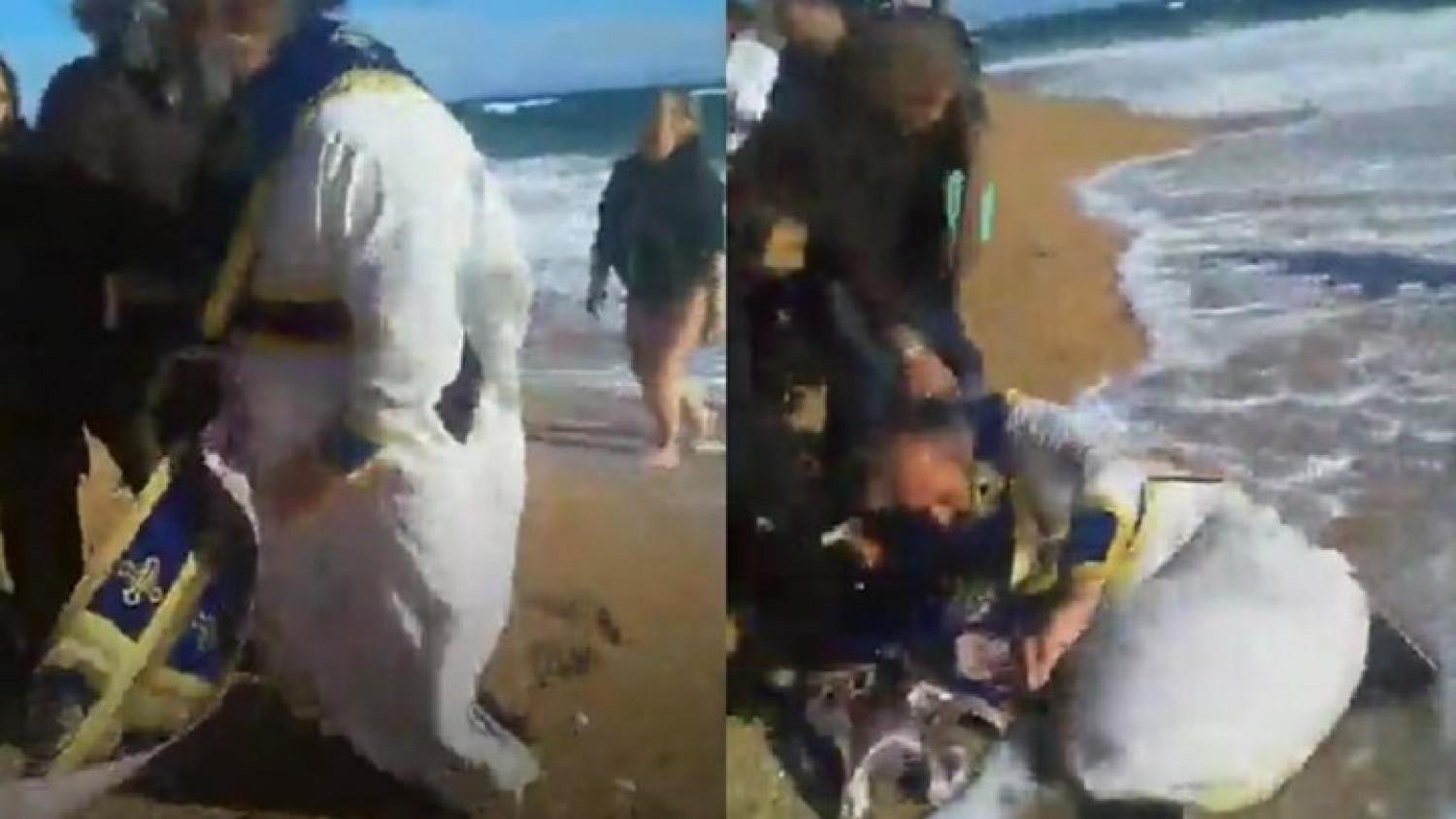 Ο ιερέας με την βοήθεια των πιστών σηκώθηκε και έριξε τον σταυρό με τη δεύτερη προσπάθεια.