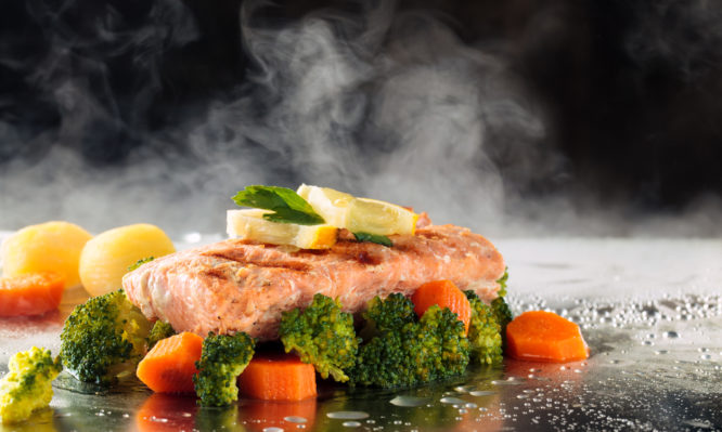 120 γρ. άπαχο ψάρι (ψητό ή βραστό), με 3 μέτριες πατάτες (βραστές ή ψητές, η καθεμία να έχει μέγεθος αυγού) και 1 φλιτζάνι βρασμένα χόρτα.