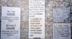 “Εδώ υπήρχε η Κάνδανος. Κατεστράφη προς εξιλασμόν της δολοφονίας 25 Γερμανών στρατιωτών.Ως αντίποινον των από οπλισμένων πολιτών, ανδρών και γυναικών, εκ των όπισθεν δολοφονηθέντων Γερμανών στρατιωτών κατεστράφη η Κάνδανος.