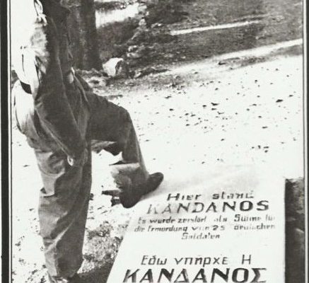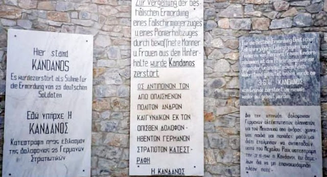 Δια την κτηνώδη δολοφονίαν Γερμανών αλεξιπτωτιστών, αλπινιστών και του Μηχανικού, από άνδρας γυναίκας, παιδιά και παπάδες μαζί και διότι τόλμησαν να αντισταθούν κατά του Μεγάλου Ράιχ, κατεστράφη την 3η-6-1941 η Κάνδανος εκ θεμελίων δια να μη επανοικοδομηθή πλέον ποτέ”