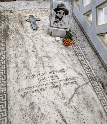Το δίστιχο του Βιζυηνού που είναι χαραγμένο στην πρόσοψη του τάφου ήταν επιλογή του Κωστή Παλαμά.