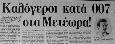 «Το κλείσιμο των μοναστηριών αποφασίστηκε χθες από όλους τους καλόγερους και γίνεται σε ένδειξη διαμαρτυρίας, γιατί το υπουργείο Πολιτισμού έδωσε άδεια να γυρισθεί στο χώρο των Μετεώρων, η ταινία ‘Για τα μάτια σου μόνο’, στην οποία όπως τονίζουν οι καλόγεροι, περιλαμβάνονται σκηνές ληστείας, βίας, σεξ κλπ., που προσβάλλουν βάναυσα την ιερότητα των Μετεώρων», αναφέρει σχετικό δημοσίευμα της εποχής.