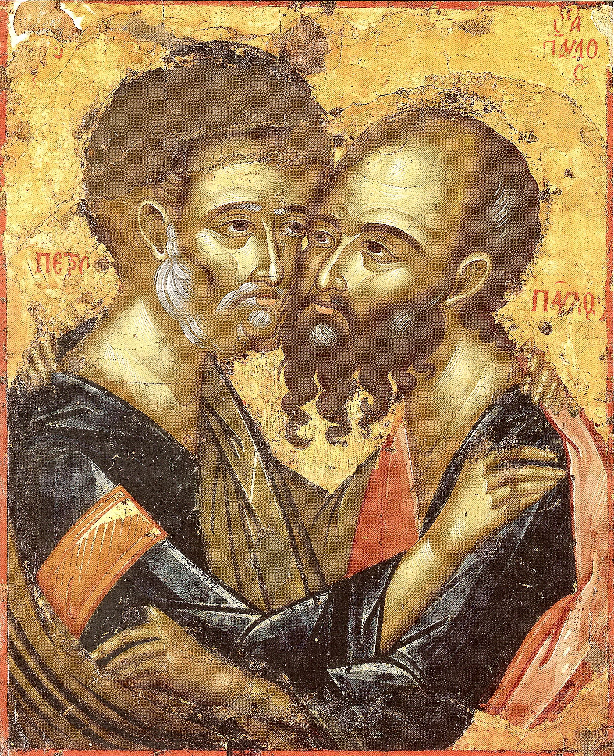 Οἱ τῶν Ἀποστόλων πρωτόθρονοι, καὶ τῆς Οἰκουμένης διδάσκαλοι, τῷ Δεσπότῃ τῶν ὅλων πρεσβεύσατε, εἰρήνην τῆ οἰκουμένῃ δωρήσασθαι, καὶ ταῖς ψυχαῖς ἡμῶν τὸ μέγα ἔλεος.