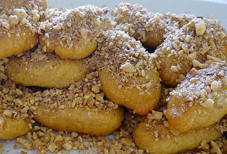 Για τη γέμιση και το ψήσιμο: Ανακατεύουμε καλά το καρύδι με τη κανέλα. Παίρνουμε από τη ζύμη κομμάτια μεγέθους μεγάλου καρυδιού και πλάθουμε στρογγυλά μπαλάκια. Πιέζουμε με το δάχτυλο για να δημιουργήσουμε μια κοιλότητα, όπου θα βάλουμε 1 κ.γ. από τη γέμιση.