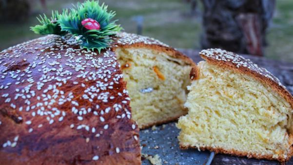 Μετά την αλείφετε με 1 αυγό χτυπημένο τη πασπαλίζετε με λίγο σουσάμι, σκεπάζετε το ταψί με λαδόκολα και τη ψήνετε σε καλά προθερμασμένο στους 170 βαθμούς φούρνο στον αέρα για 45 λ. Τη ξεφορμάρετε και την αφήνετε να κρυώσει τελείως.
