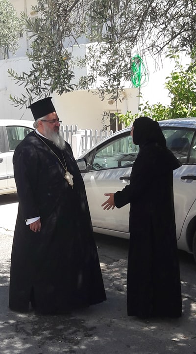 Ο Γέροντας, την προσφώνησε και εξήρε το πολύπλευρο έργο της, καθώς είναι γέννημα της Ρόδου με Συμαϊκή καταγωγή (το γένος Φαρμακίδου). Της προσέφερε ένα πεντάκερο για τις αρτοκλασίες που θα τελούνται στην Ιερά Μονή, ως ενθύμιο της επισκέψεως και του προσκυνήματος της στον Ιερό Ιδρυματικό Ναό του Αγίου Τρύφωνος.