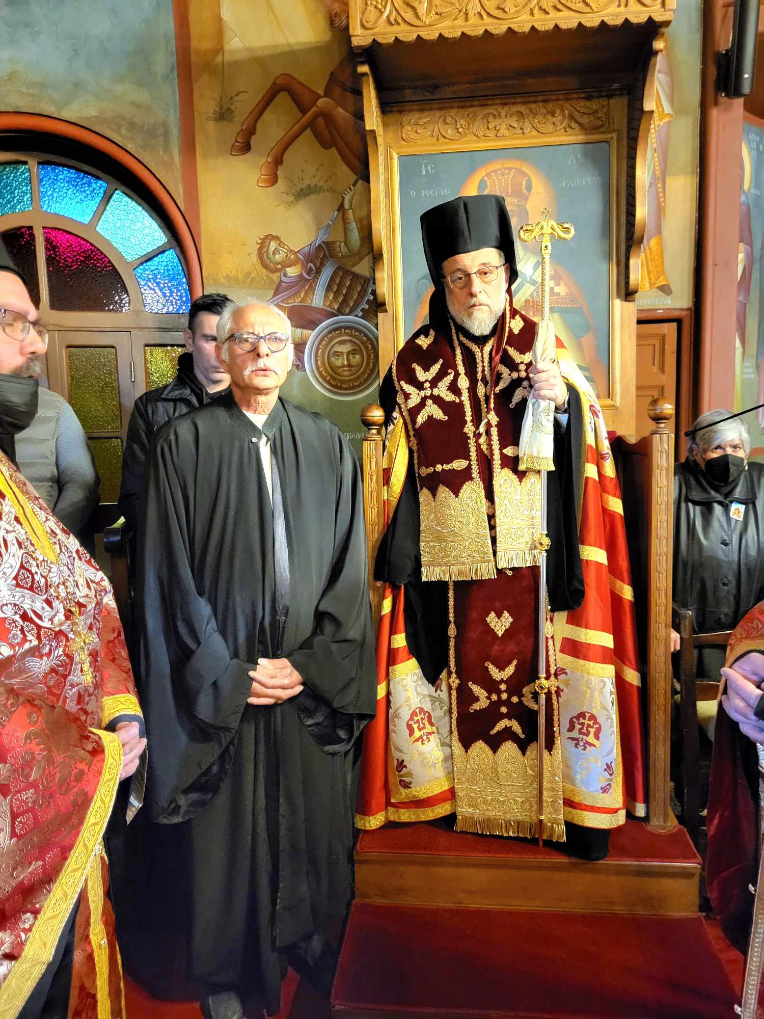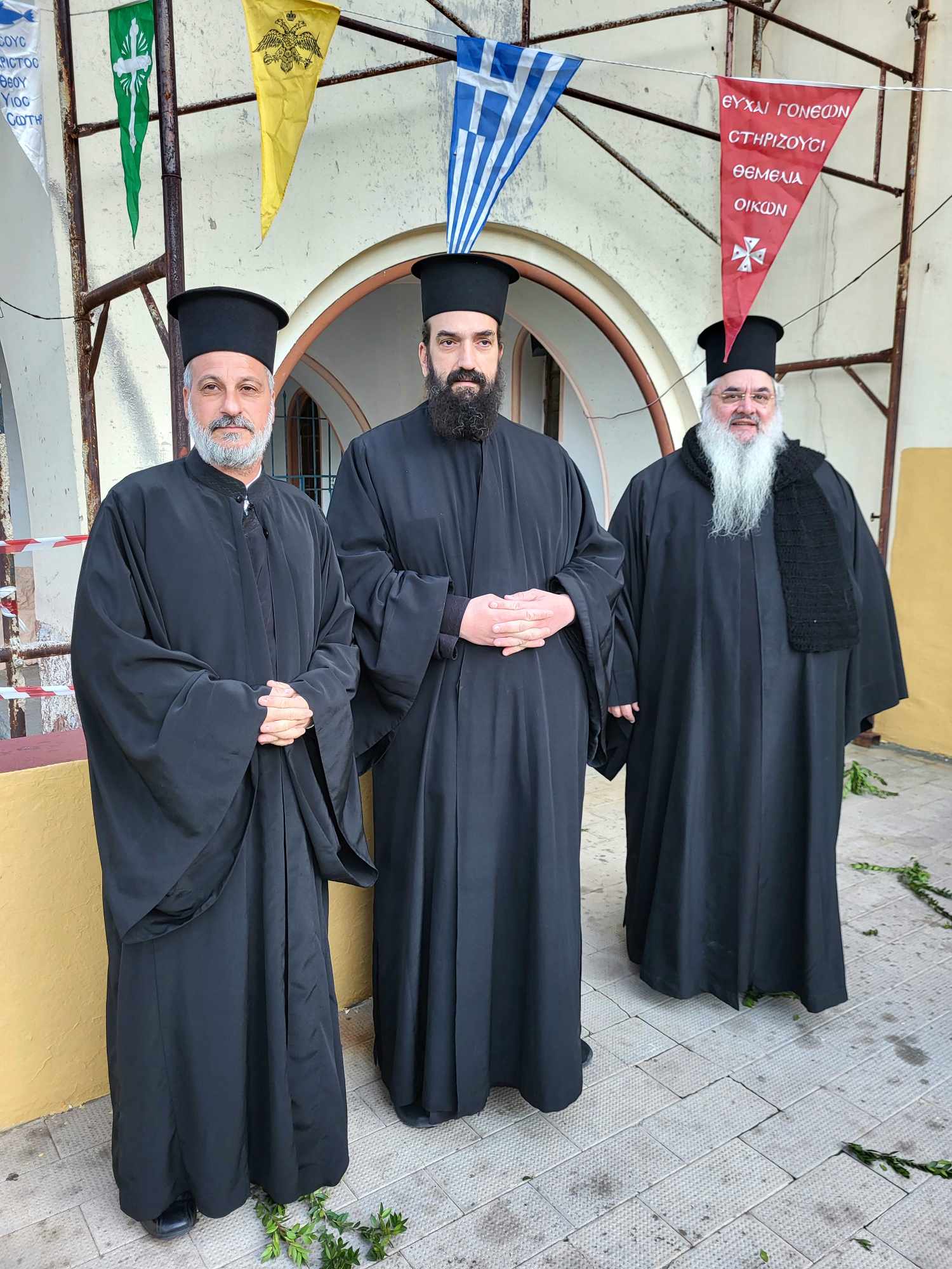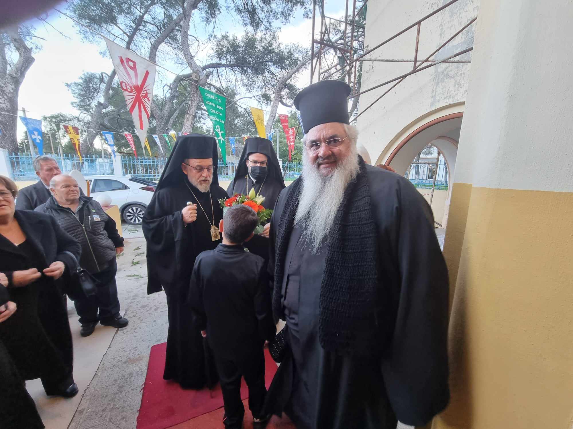 Εν μέσω κωδωνοκρουσιών, υποδέχτηκαν τον Σεβασμιώτατο ο Πανοσιολογογιώτατος, Αρχιμανδρίτης και Προεστός του Ι. Ιδρυματικού Ναού του Αγίου Τρύφωνος, Αθανάσιος Μισσός και οι πατέρες, Παντελεήμων Σπανός, Ευάρεστος Ηλίας, Γεώργιος Καρπαθάκης.