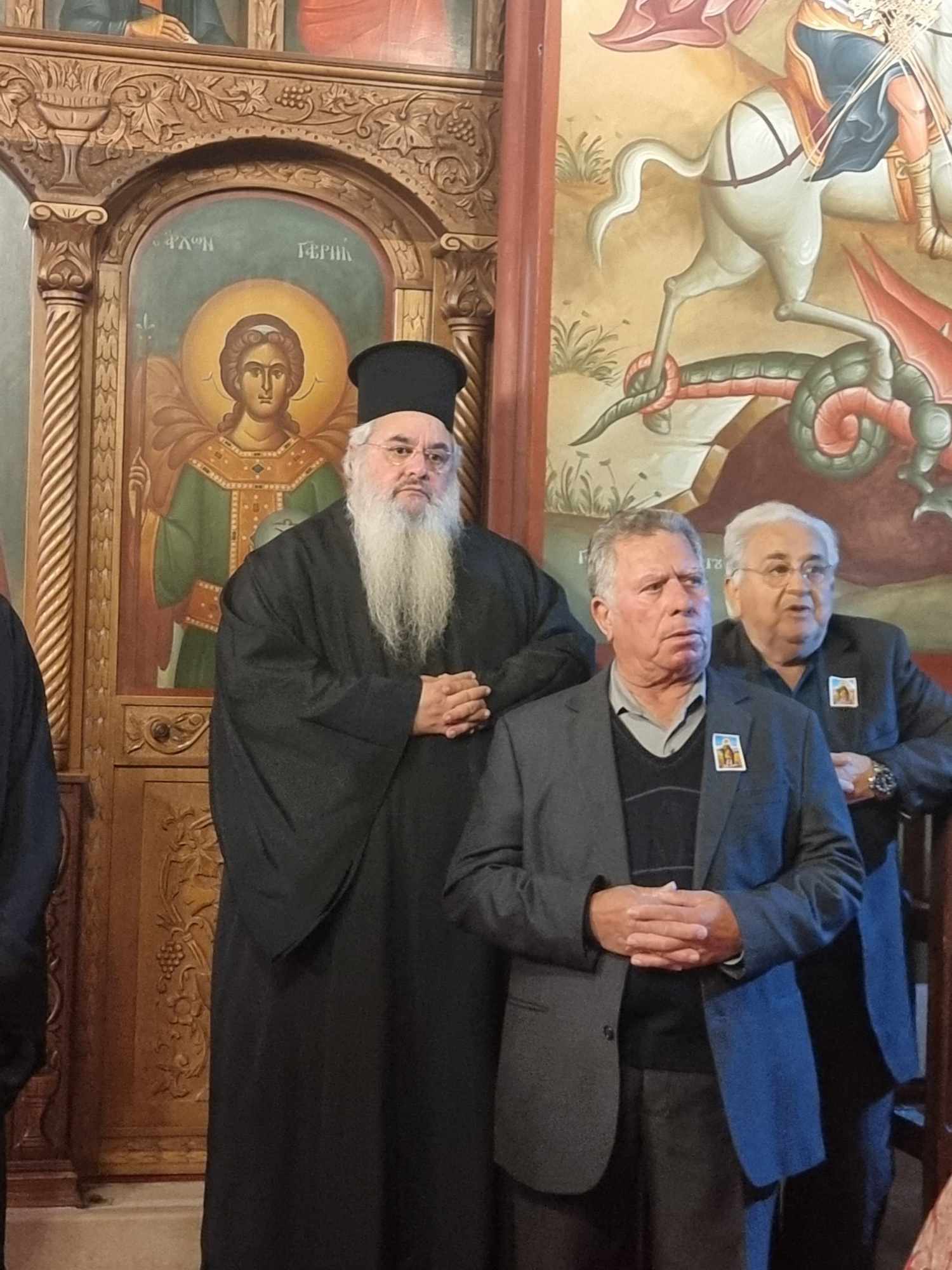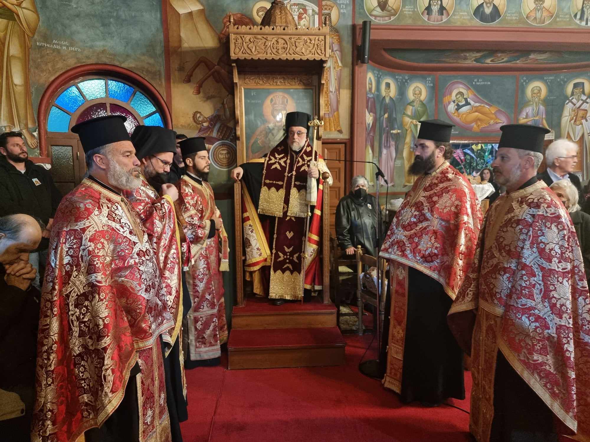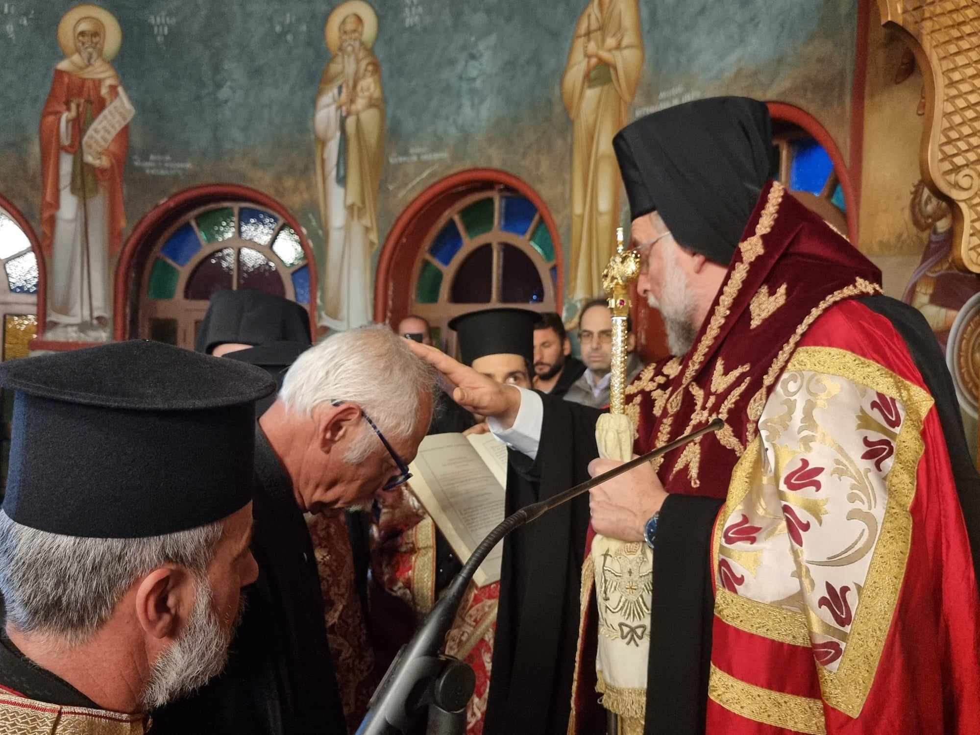 Εν μέσω κωδωνοκρουσιών, υποδέχτηκαν τον Σεβασμιώτατο ο Πανοσιολογογιώτατος, Αρχιμανδρίτης και Προεστός του Ι. Ιδρυματικού Ναού του Αγίου Τρύφωνος, Αθανάσιος Μισσός και οι πατέρες, Παντελεήμων Σπανός, Ευάρεστος Ηλίας, Γεώργιος Καρπαθάκης.