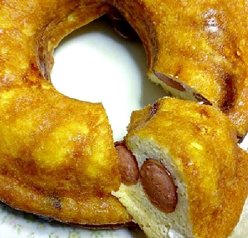 Βάζουμε το μείγμα στην φόρμα αργά για να μην κουνήσουν τα λουκάνικα.Στα ενδιάμεσα κάνουμε ρολάκια τις φετουλες τυράκι και τις τοποθετούμε εναλλάξ.