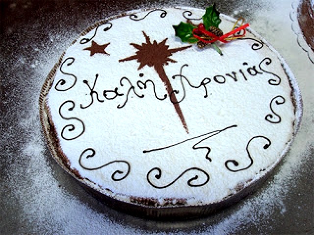 Σημείωση : ζωγραφίστε ότι σχήμα θέλετε πάνω σε ένα χαρτί και κόψτε το προσεκτικά με ένα κοπίδι. Τοποθετήστε το χαρτί με τις τρύπες πάνω στην Βασιλόπιτα και ρίξτε με προσοχή την χρωματιστή ζάχαρη.