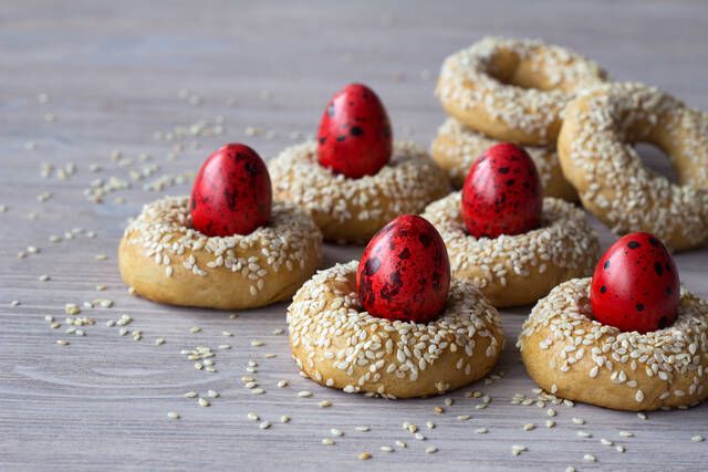 Παίρνετε μικρά κομμάτια ζύμης και τα πλάθετε σε σχήμα χοντρού κορδονιού. Βάζετε ένα κόκκινο αυγό στο κέντρο και διπλώνετε τα δύο άκρα του κορδονιού, στρίβοντάς τα μεταξύ τους για να πάρουν το σχήμα που βλέπετε στη φωτογραφία.