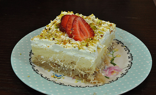 Απλώνω πάνω από το σιροπιασμένο φύλλο (ας είναι ζεστό) την κρέμα.