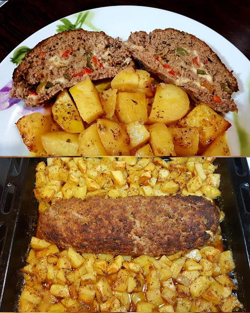 Ανακατεύουμε όλα τα υλικά του κιμά μαζί και το αφήνουμε στο ψυγείο για μισή ώρα…. μετά παίρνουμε τον κιμά, τον βάζουμε πάνω σε λαδόκολλα, τον ανοίγουμε σε παραλληλόγραμμο, βάζουμε το τυρί σε όλη την επιφάνεια του κιμά, τις πιπεριές και κλείνουμε το ρόλο με την βοήθεια της λαδόκολλας, το βάζουμε στο ταψί, αφαιρούμε την λαδόκολλα και το ψήνουμε μαζί με τις πατάτες στους 180° για μια ώρα στον αέρα.