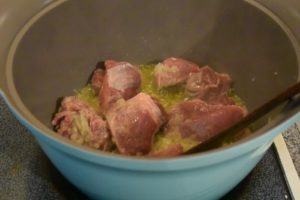 Βάζουμε το λάδι με τα κρεμμύδια και στεγνά τα κομμάτια κρέας στην κατσαρόλα και τα σοτάρουμε γυρνώντας τα με ξύλινη κουτάλα για αρκετά λεπτά.
