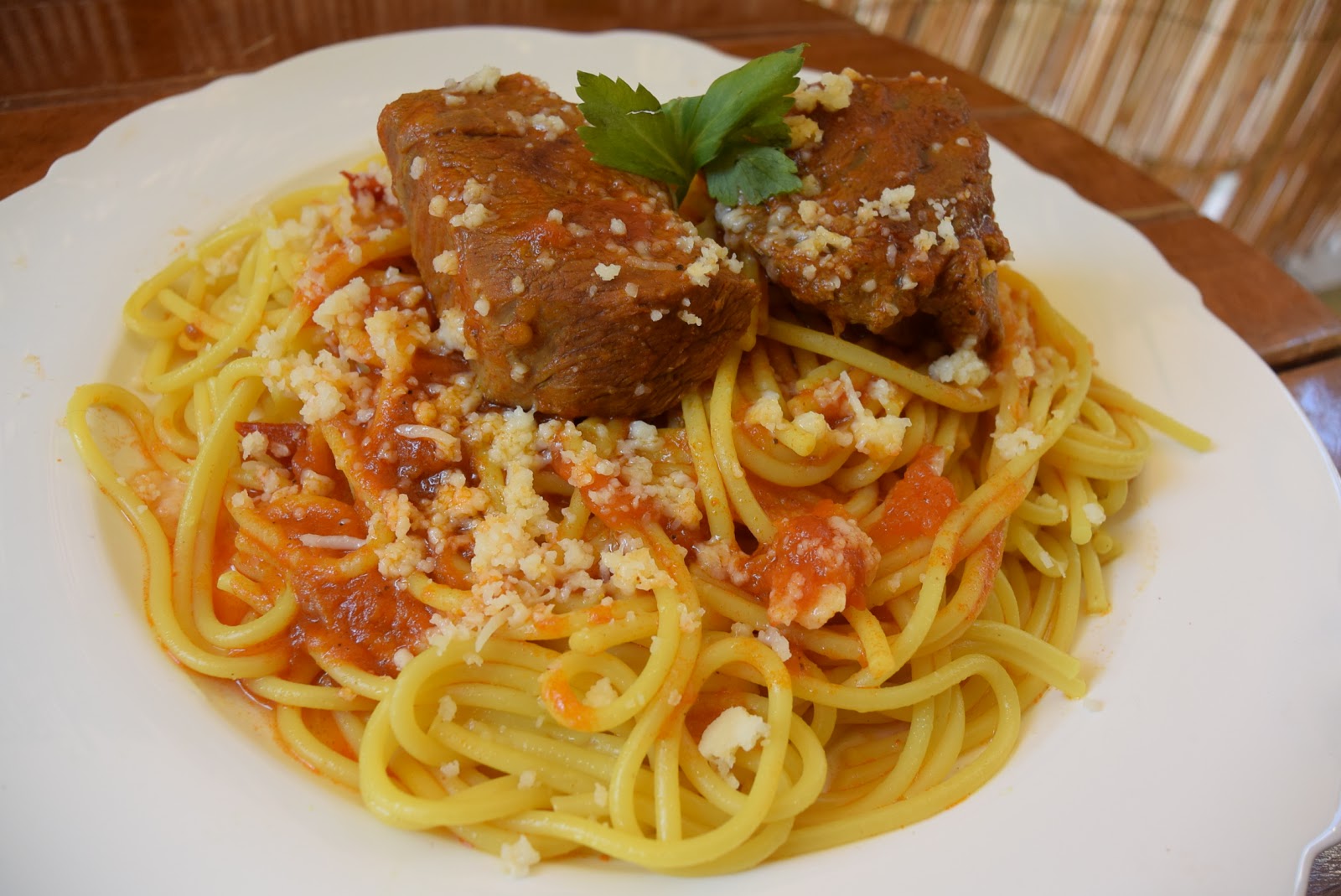 Σερβίρουμε με μακαρόνια με πιλάφι με πατάτες τηγανητές ή πουρέ .