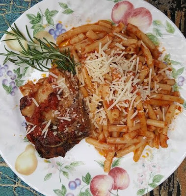 Αλατοπιπερώνουμε βάζουμε στο ταψί μαζί με τα φύλλα φασκομηλιάς την ντομάτα μας και το πουμαρο. Σουρώνουμε τη μαρινάτα και προσθέτουμε το υγρό στο ταψί μας.Σκεπάζουμε και ψήνουμε για μια ώρα και κάτι σε μέτριο φούρνο. Εν το μεταξύ μισοβράζουμε τα μακαρόνια και τα σουρώνουμε κοντά στο τέλος του ψησίματος.