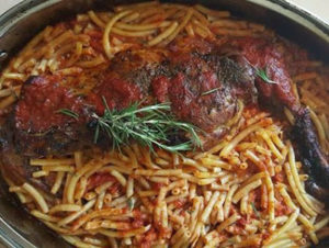 Το βγάζουμε ελέγχουμε αν είναι ψημένο συμπληρώνουμε νεράκι αν χρειαστεί και προσθέτουμε τα μισοψημένα μακαρόνια και φουρνίζουμε με το ταψί ξεσκέπαστο να ροδίσει και να τραβήξει τα ζουμάκια του!!!
