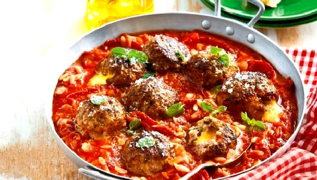 Μόλις βράσει αφαιρείτε το κλαδάκι δεντρολίβανου, μεταφέρετε το μείγμα σε ταψί, προσθέτετε το μανεστράκι και τα κεφτεδάκια, αλατοπιπερώνετε, και βράζετε για 30′ ανακατεύοντας ανά διαστήματα.