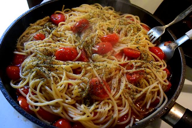 Ρίχνουμε τον βασιλικό και φρεσκοτριμμένο πιπέρι τα ανακατεύουμε κι είναι έτοιμα για σερβίρισμα με λίγο τυράκι από πάνω.