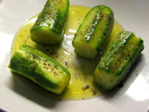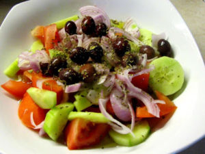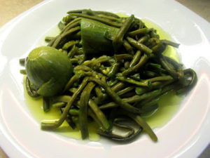 Τηγανητά καλαμαράκια αμπελοφάσουλα σαλάτα και κολοκυθάκια βραστά.