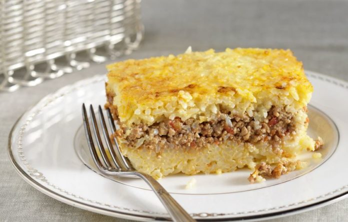 Απλώνουμε ομοιόμορφα το μείγμα του κιμά και καλύπτουμε με το υπόλοιπο ρύζι, το οποίο στρώνουμε καλά με τη ράχη ενός κουταλιού.