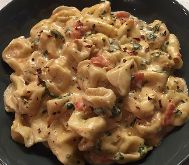 Βράζουμε τα τορτελίνια σε αλατισμένο νερό σύμφωνα με το χρόνο βρασμού της συσκευασίας. Όταν είναι έτοιμα τα σουρώνουμε.