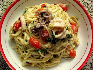Προσθέτουμε τις «φούσκες» με το μελάνι, 2 κουτάλες νερό από βράσιμο των ζυμαρικών και, τέλος, τα ζυμαρικά βρασμένα al dente.