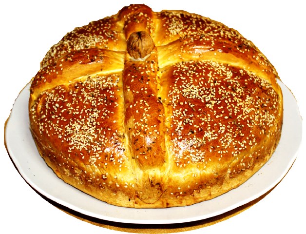 Μπορούμε αντί για πλεξούδα να σχηματίσουμε ένα σταυρό και στο κέντρο του να βάλουμε ένα καρύδι. Πασπαλίζουμε με σουσάμι και τοποθετούμε σε ελαφρά ζεστό φούρνο.