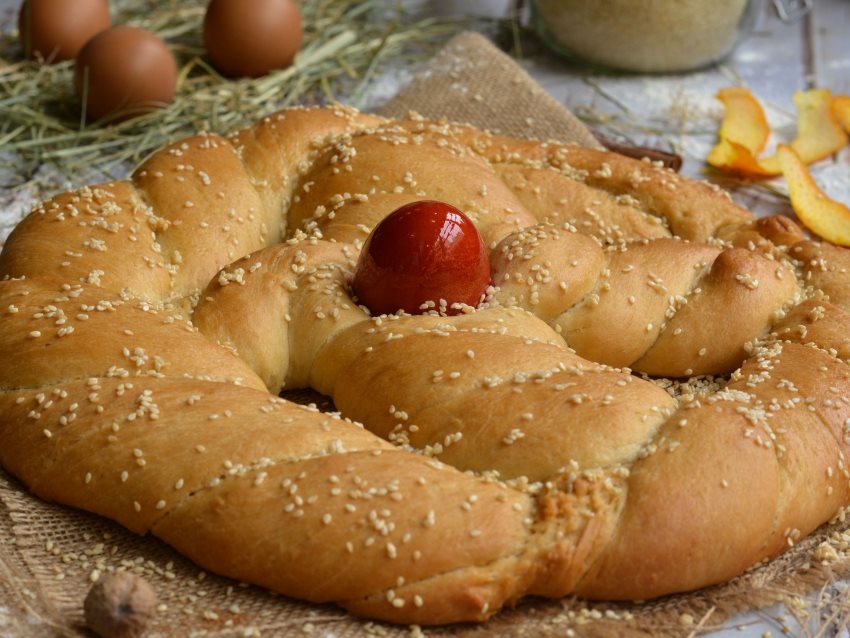 Αποσπάτε ένα μικρό κομμάτι ζύμης για διακόσμηση και ζυμώνετεξανά τη ζύμη σας δίνοντάς της σχήμα κουλούρας ή καρβελιού. Πλάθετε με τοκομμάτι ζύμη που κρατήσατε δύο χονδρά κορδόνια και τα τοποθετείτε στο ψωμίσχηματίζοντας έναν σταυρό. Μπήγετε στο κέντρο ή σε όποιο σημείο θέλετε ένα κόκκινο αυγό. Πασπαλίζετε με σουσάμι.
