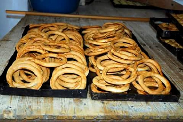 Σε χλιαρό νερό, βάζουμε την μαγιά και την σκεπάζουμε λίγο να ανέβει, προσθέτουμε στο αλεύρι την αραιωμένη μαγιά, το λιωμένο χλιαρά βούτυρο, το κοπανισμένο μαστίχη, αλατάκι, ζάχαρι και του ζυμώνουμε.